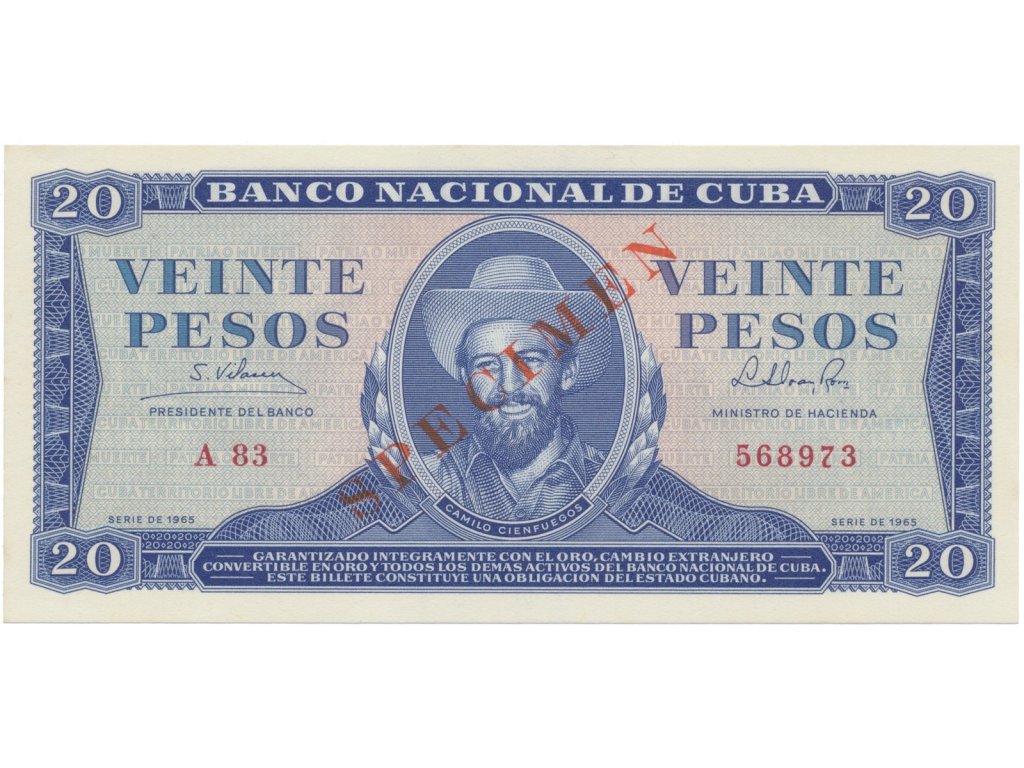 Kuba, 20 Pesos 1965, tisk STC Praha, původní bankovní vzor, přetisk SPECIMEN, P.97cs