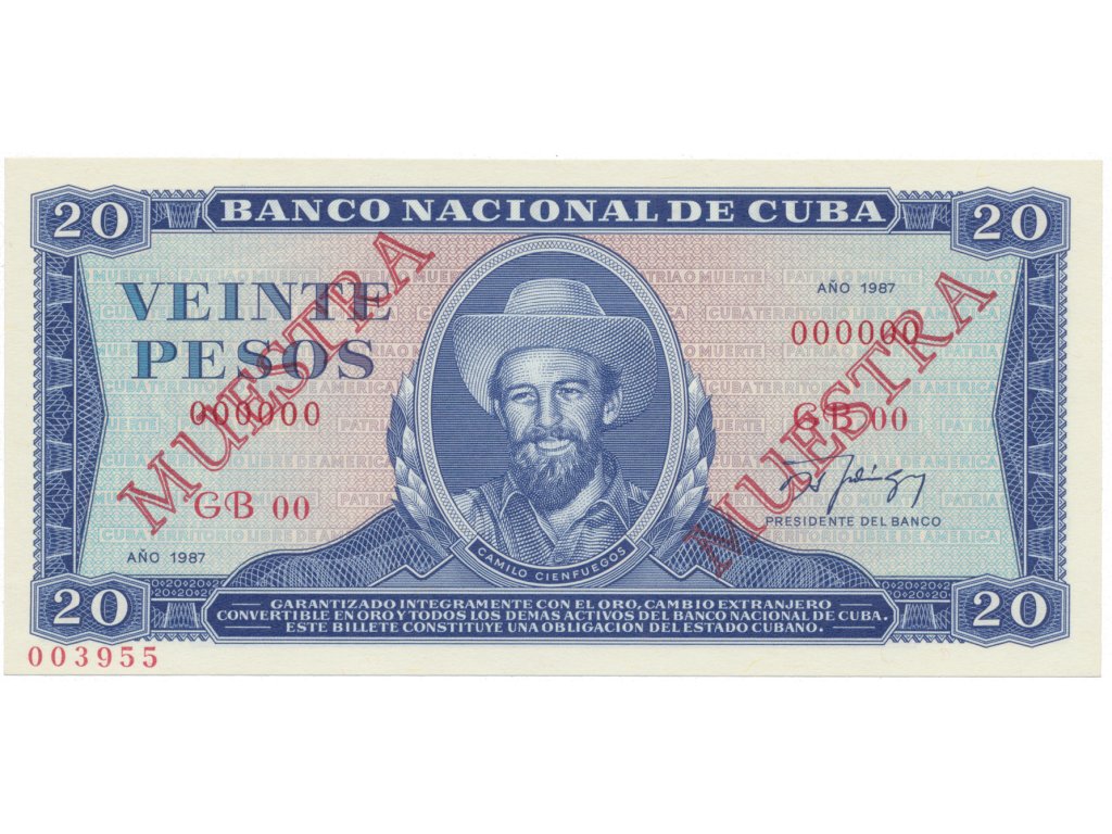 Kuba, 20 Pesos 1987, tisk STC Praha, anulát - 2x MUESTRA, bankovní vzor, P.105ds