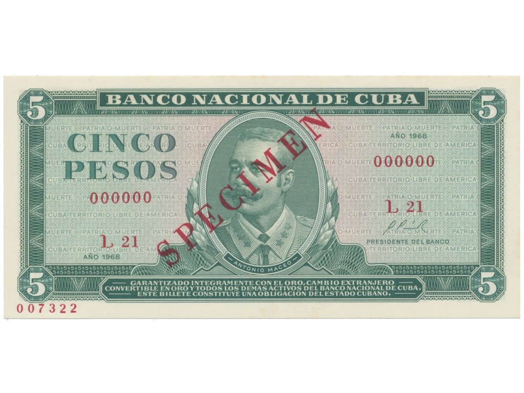 Kuba, 5 Pesos 1968, tisk STC Praha, anulát - SPECIMEN, bankovní vzor, P.103as