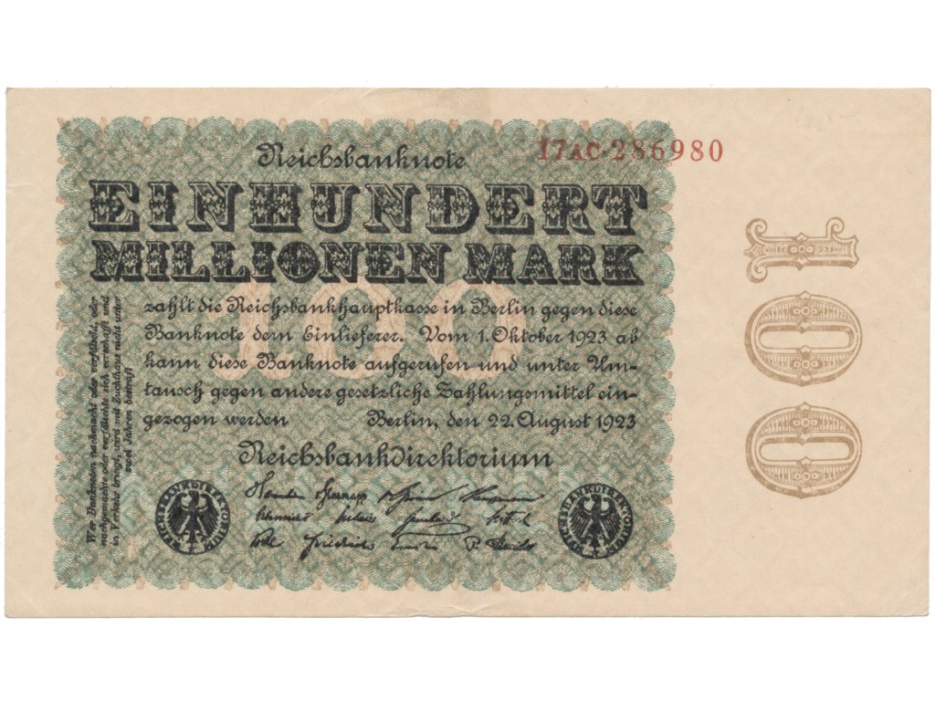 Německo, 100 Millionen Mark 1923, Kreuzblütten, Ro.106e