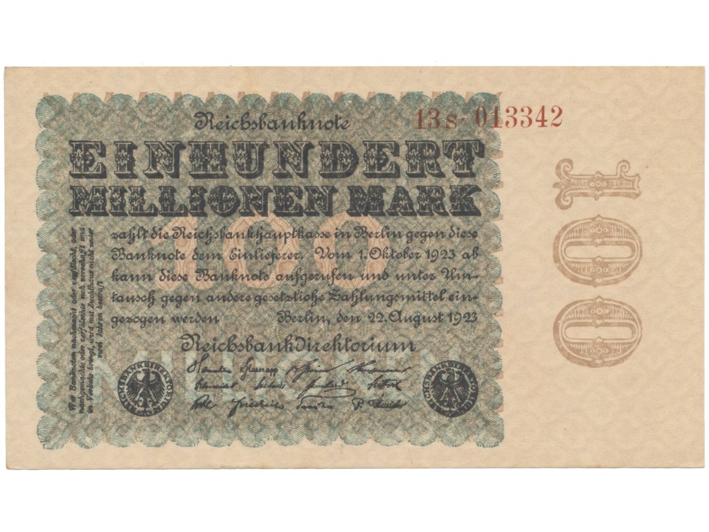 Německo, 100 Millionen Mark 1923, Kreuzblütten, Ro.106e