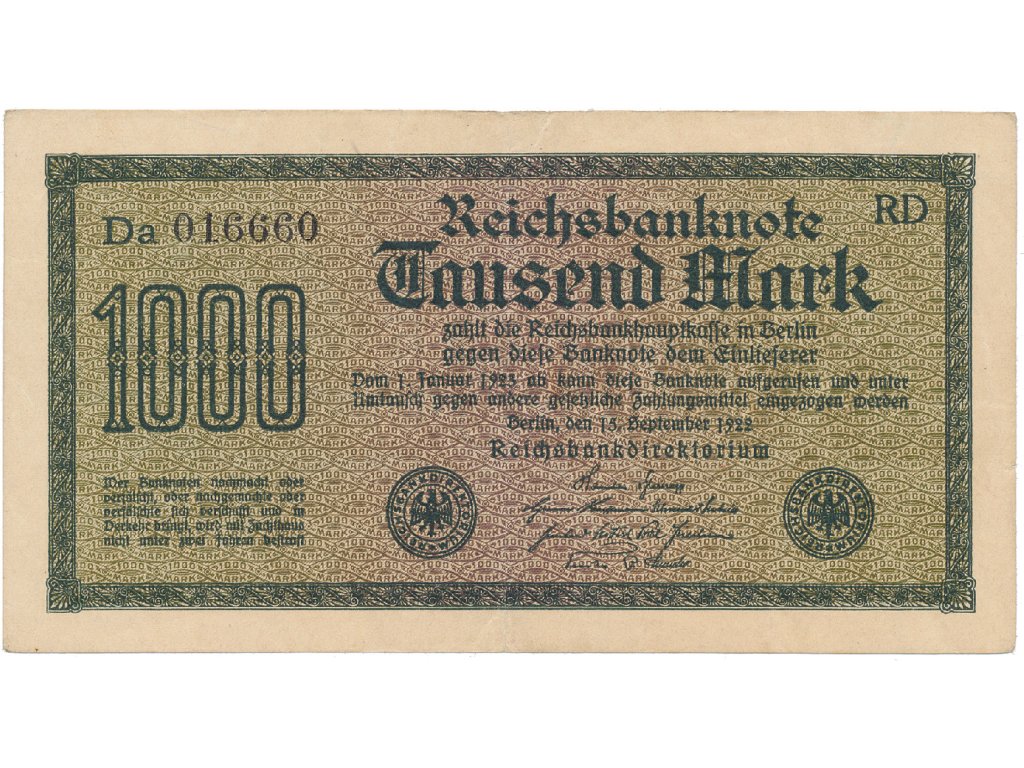Německo, 1000 Mark 1922, vod. Hakensterne, černé 6-místné číslo, Ro.75b