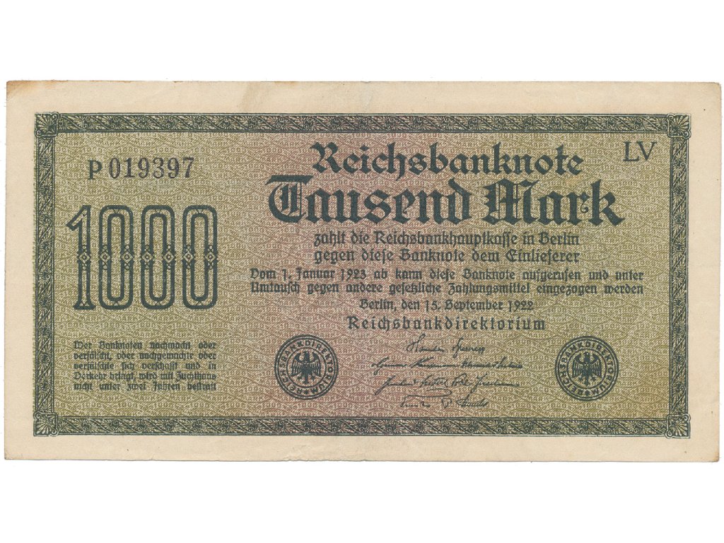 Německo, 1000 Mark 1922, vod. Hakensterne, černé 6-místné číslo, Ro.75b