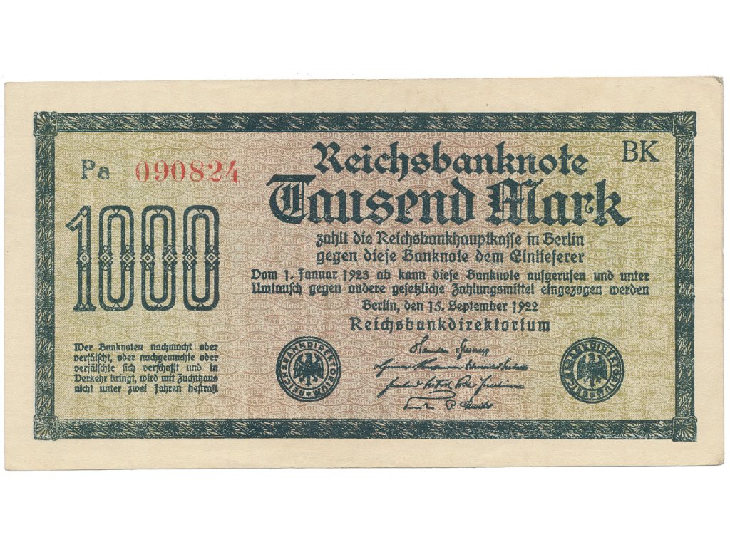 Německo, 1000 Mark 1922, vod. Mäander, červené 6-místné číslo, Ro.75g