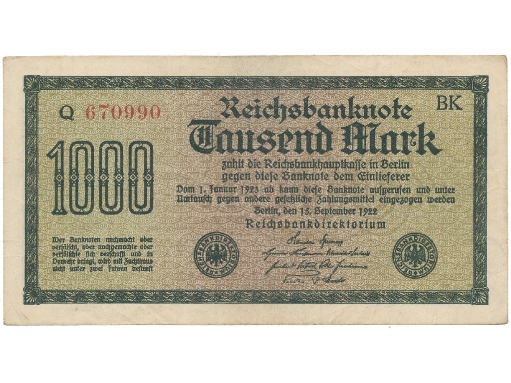 Německo, 1000 Mark 1922, vod. Mäander, červené 6-místné číslo, Ro.75g