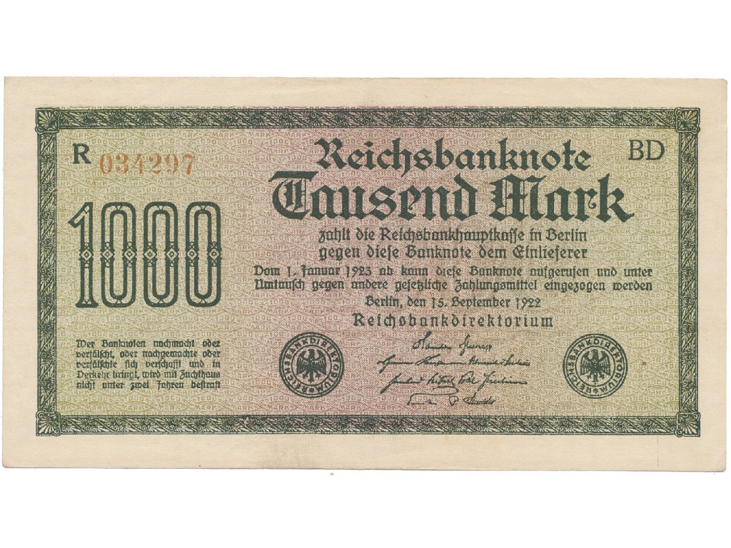 Německo, 1000 Mark 1922, vod. Mäander, hnědé 6-místné číslo, Ro.75i