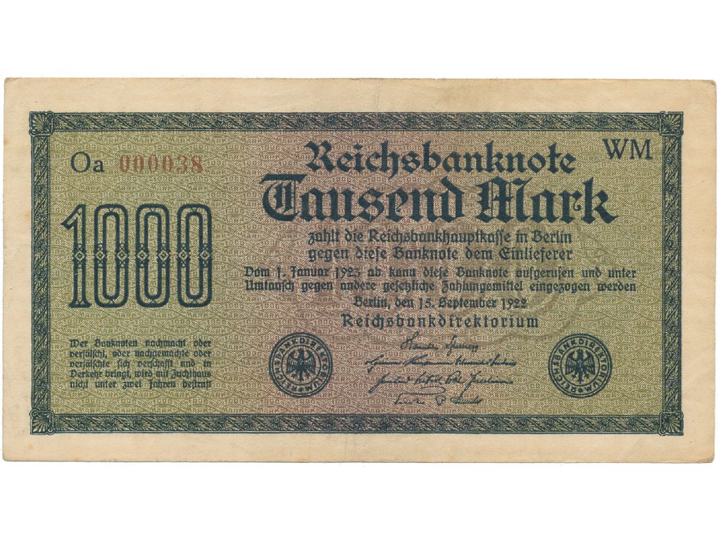 Německo, 1000 Mark 1922, vod. Mäander, hnědé číslo 000038, Ro.75i