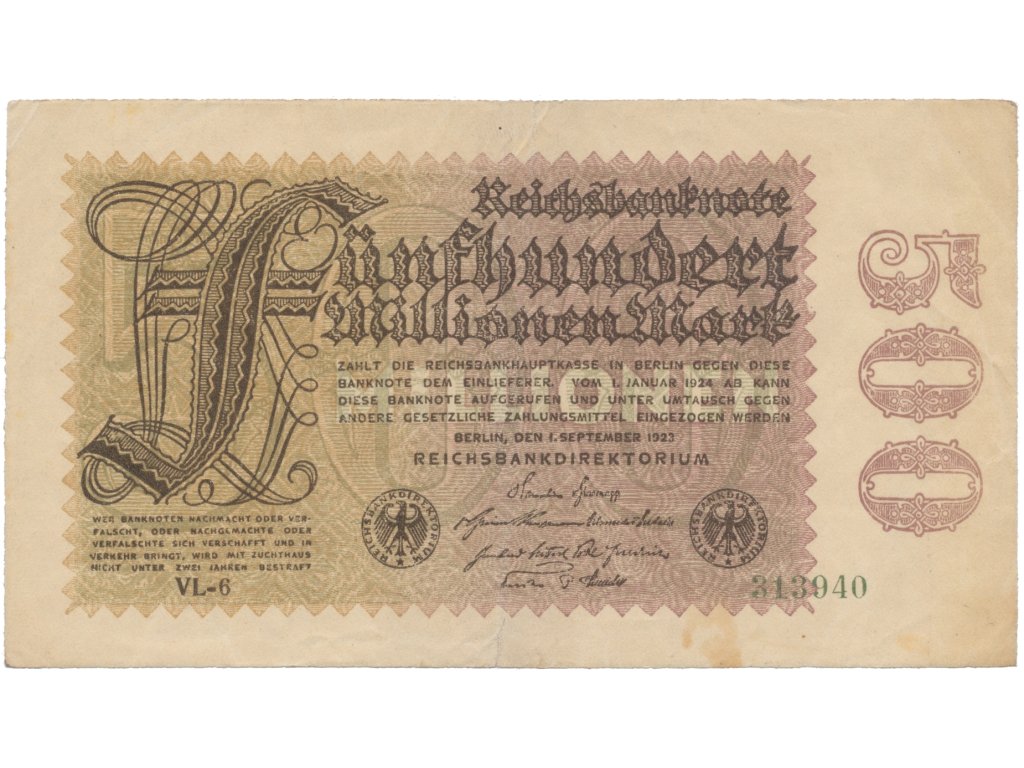 Německo, 500 Millionen Mark 1923, vodoznak Hakensterne, Ro.109d