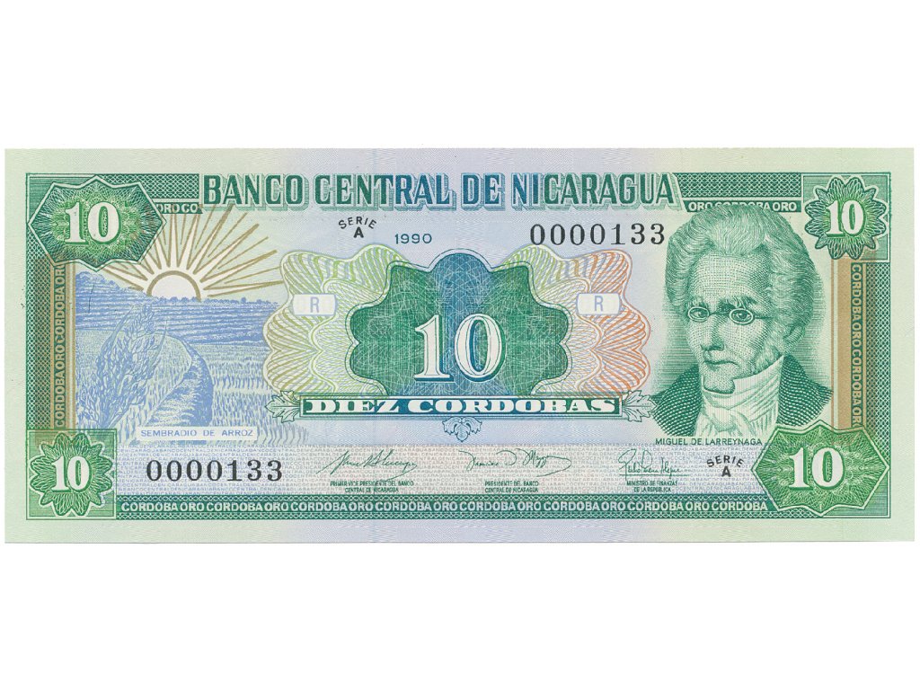 Nikaragua, 10 Cordobas 1990, nízké číslo A 0000133, P.175