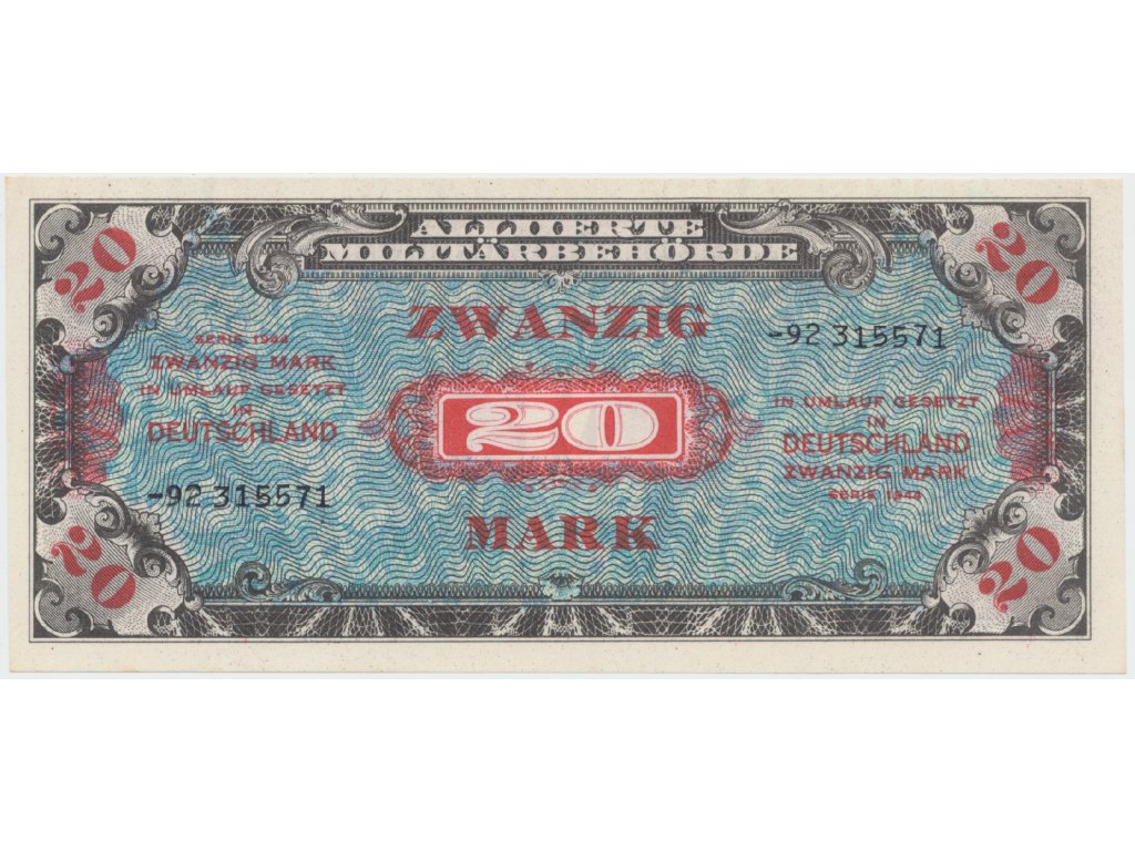 Okupační poukázky Allierte, 20 Mark 1944, tisk SSSR, 8-místný číslovač, Hej.AM5d