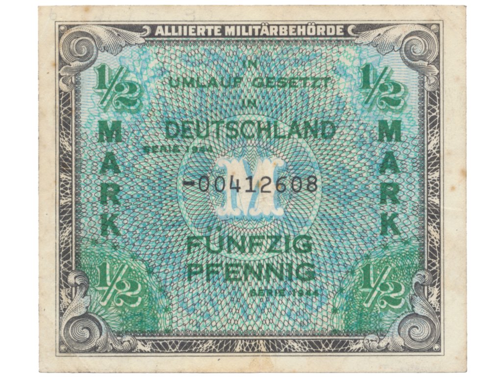 Okupační poukázky Allierte, 1/2 Mark 1944, tisk USA, náhradní 8-místný číslovač, Hej.AM1b