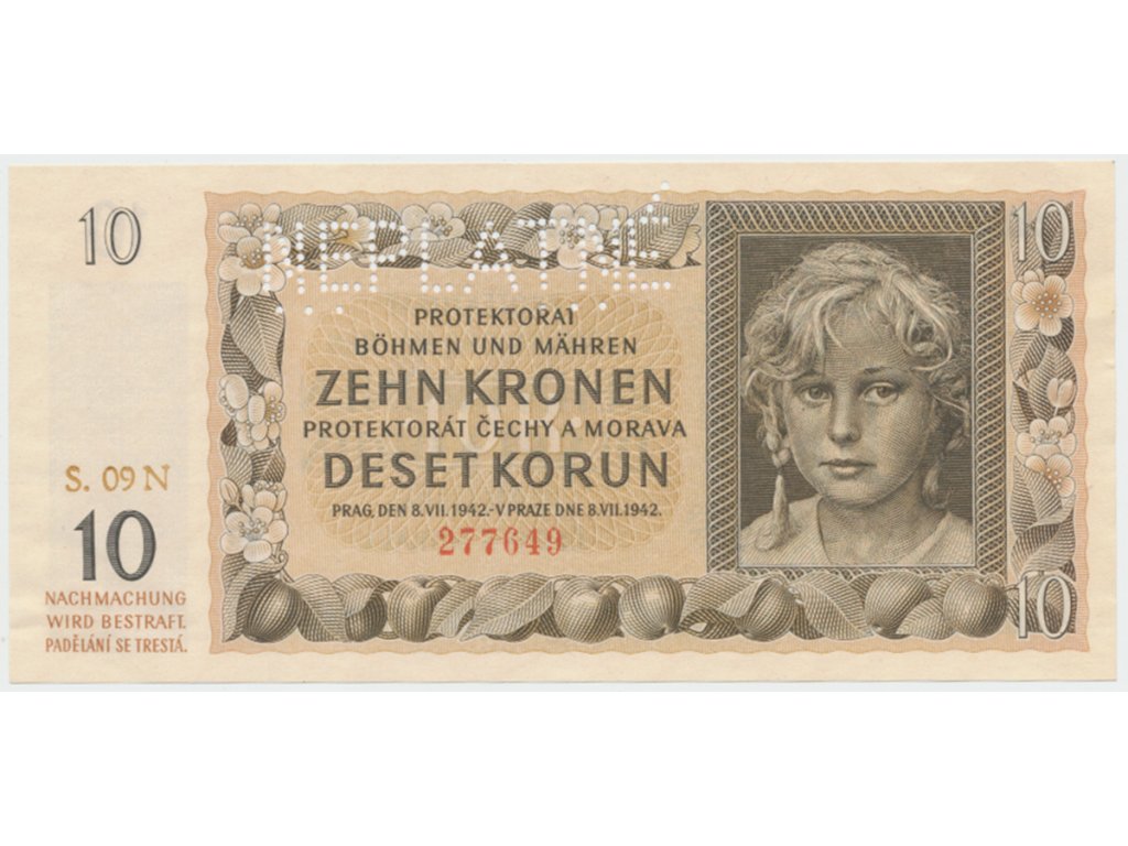 Protektorát Čechy a Morava, 10 Koruna 1942, série N, tisk Neubert, perf. 1x NEPLATNĚ, Hej.37b1.S2