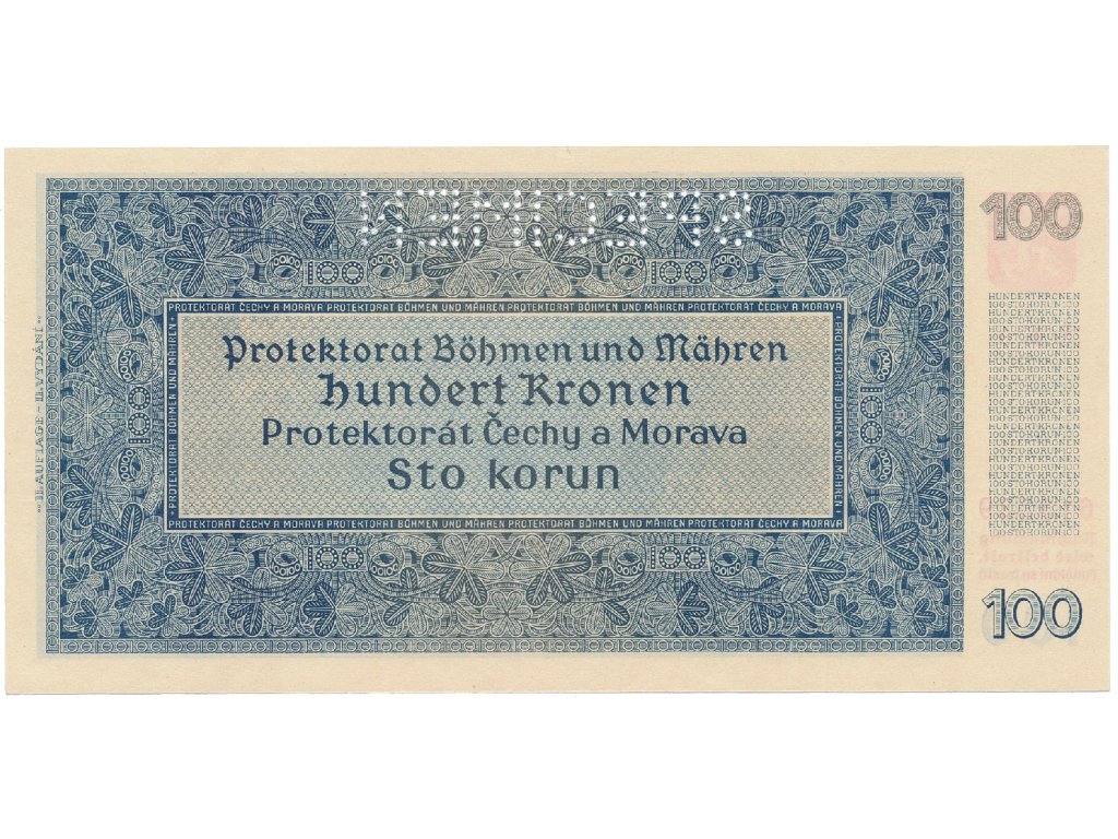 Protektorát Čechy a Morava, 100 Koruna 1940, II. vydání, tisk TB NBČM, série A, perf.1x SPECIMEN, Hej.33aA.S1