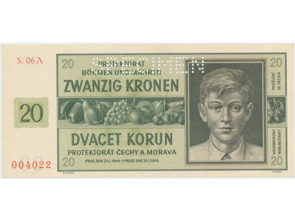 Protektorát Čechy a Morava, 20 Koruna 1944, série A, tisk NBČM, perf. 1x SPECIMEN, Hej.40a.S1