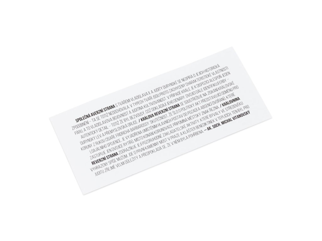 „Společná averzní strana s tvářemi Vladislava II. a Judity Durynské se neopírá o jejich historická zpodobnění – ta se totiž nedochovala. V typech tváří jsou proto zachyceny charakteristické vlastnosti páru, a to Vladislavova bojovnost a Juditina kultivovanost. V případě krále je k dispozici alespoň jeden autentický detail – totiž že byl bezvousý, což dokládají jeho denáry,“ vysvětluje akademický sochař Michal Vitanovský. Královskou dvojici dále identifikují erby – durynský lev a přemyslovská orlice. „Králova reverzní strana se soustřeďuje na získání královské koruny z rukou císaře Fridricha Barbarossy. Skutečnost, že šlo o politický akt představující odměnu pro loajálního spojence, je vyjádřena umístěním hlavních postav do pozadí a absencí dvořanů, které zastupuje jen dvojice rytířů. Místo konání korunovace připomíná městský znak Řezna. Královnina reverzní strana pak zdůrazňuje její pozoruhodné zakladatelské aktivity, které bývaly ve středověku vyhrazeny spíše mužům. Jde o první kamenný most v Praze a klášter benediktinek v Teplicích. Ten byl pro Juditu zřejmě velmi důležitý a předpokládá se, že v něm byla pohřbena,“ dodává autor dukátů.
