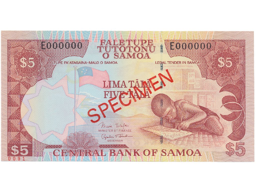 Samoa, 5 Tala (2002), bankovní vzor, E 000000, přetisk SPECIMEN, P.33bs