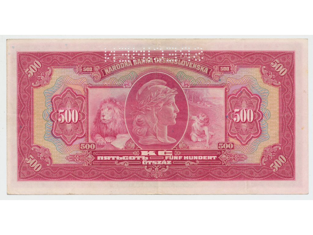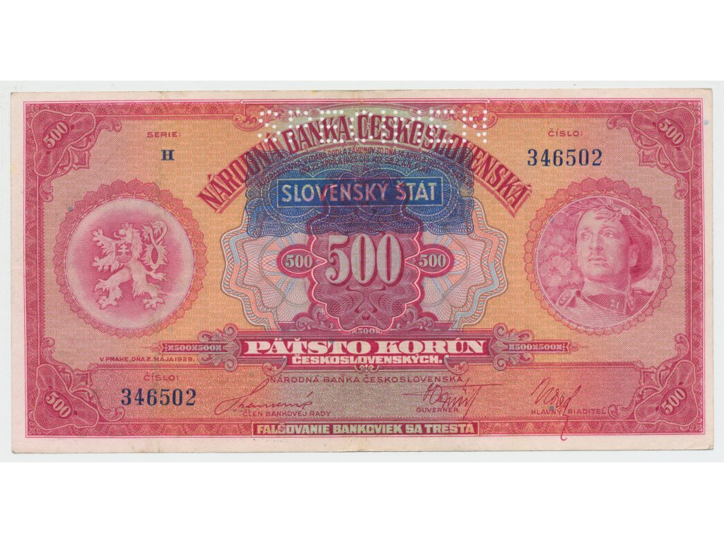Slovensko, 500 Koruna 1929/1939 + přetisk, perf. 1x SPECIMEN, Hej.46a.S1