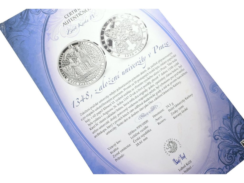 Stříbrná investiční medaile - 1348, Založení univerzity v Praze - Ag 24,5 g - 999/1000 + Certifikát