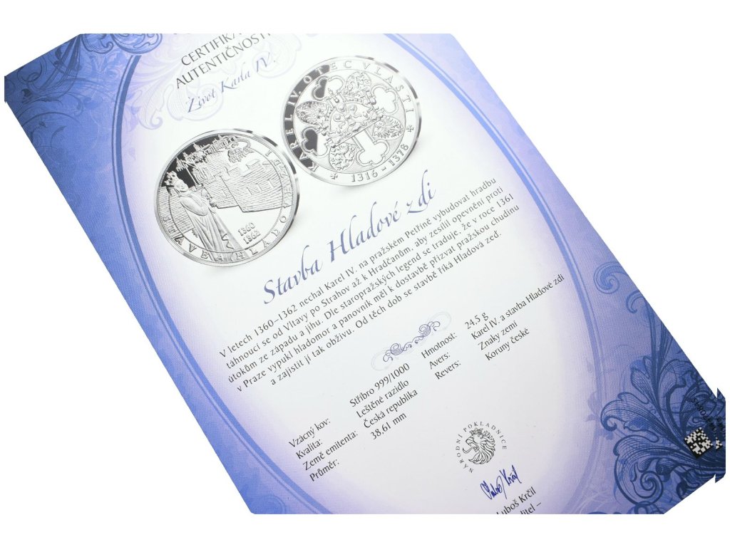 Stříbrná investiční medaile - Stavba Hladové zdi - Ag 24,5 g - 999/1000 + Certifikát