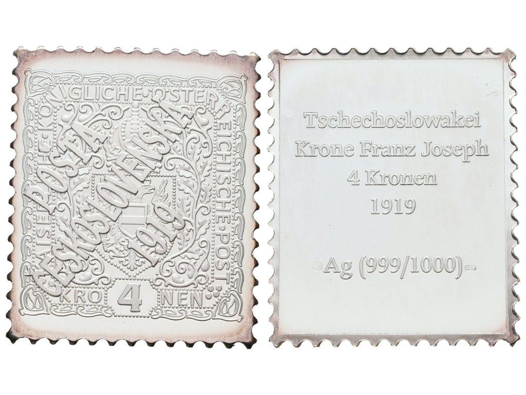 Stříbrná známka - Československo - přetisk na 4 koruně -1919 - Ag 8 g 999/1000