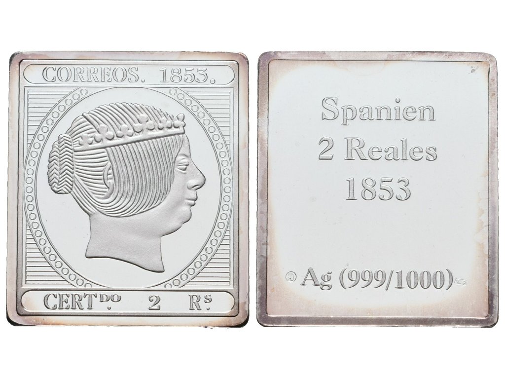 Stříbrná známka - Španělsko - královna Isabela z roku 1853 - Ag 7 g - 999/1000