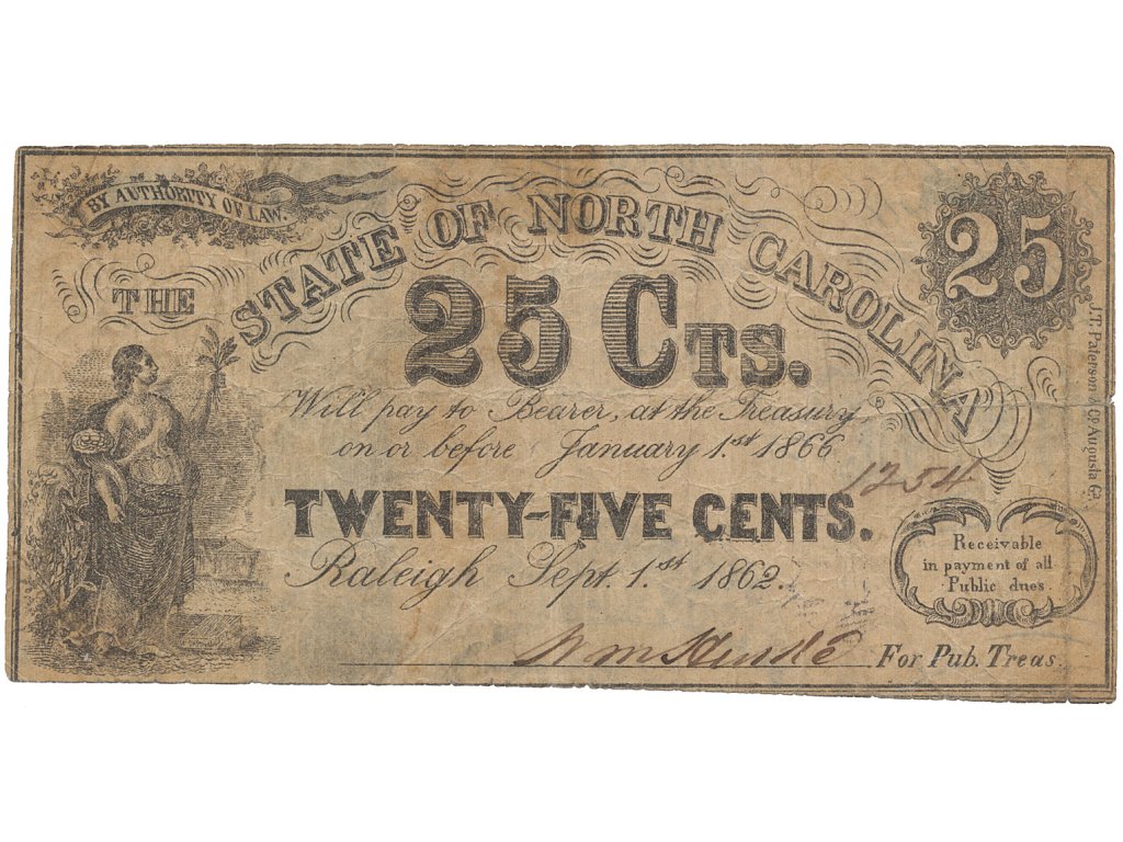 USA, North Carolina, 25 Cents 1. 9. 1862, na Rv. část tisku cenného papíru