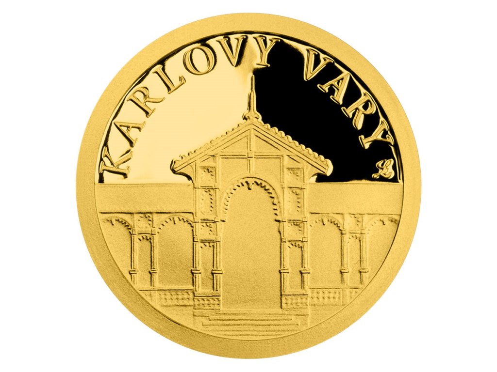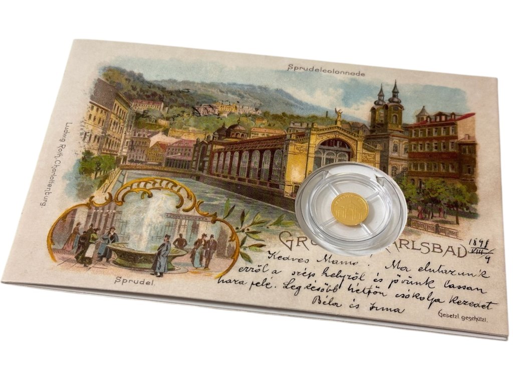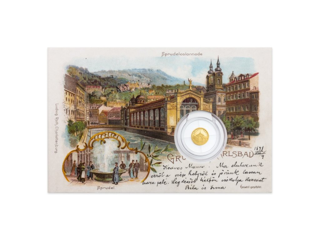 Zlatá mince Karlovy Vary - dobová pohlednice