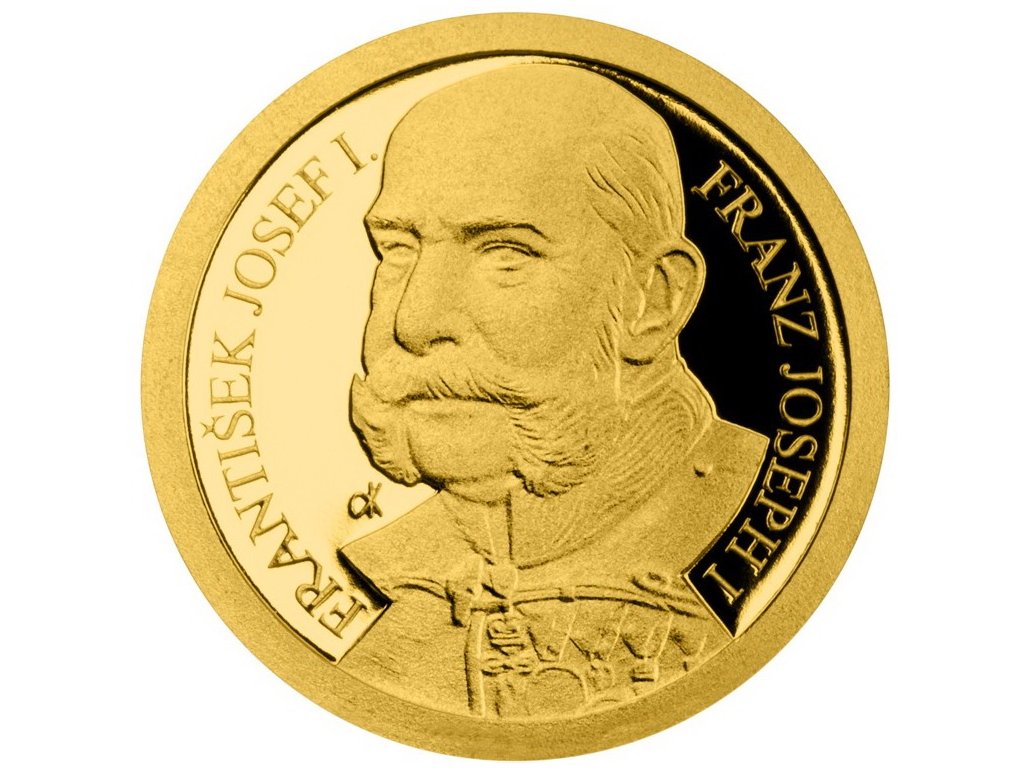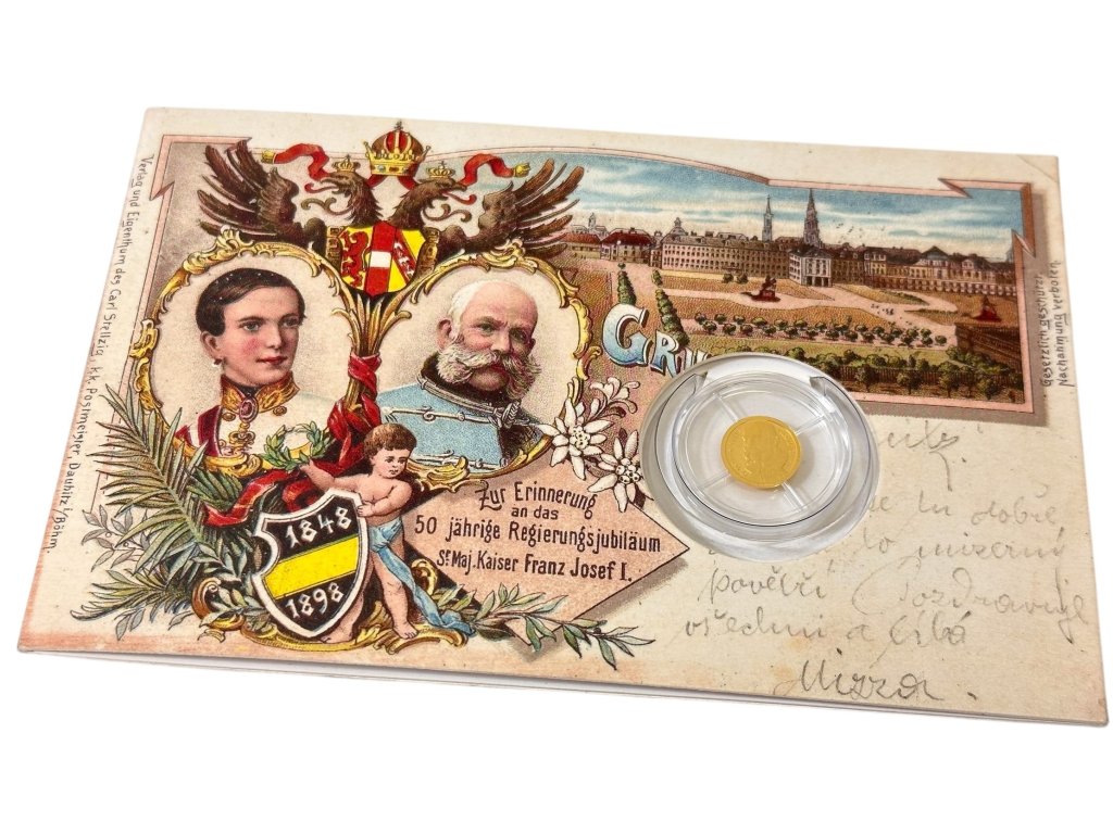 Zlatá mince František Josef I. - dobová pohlednice